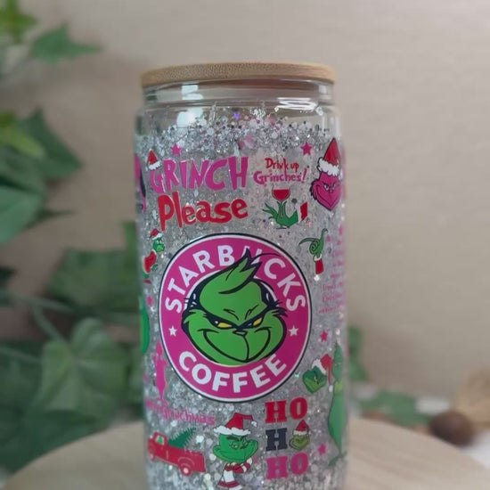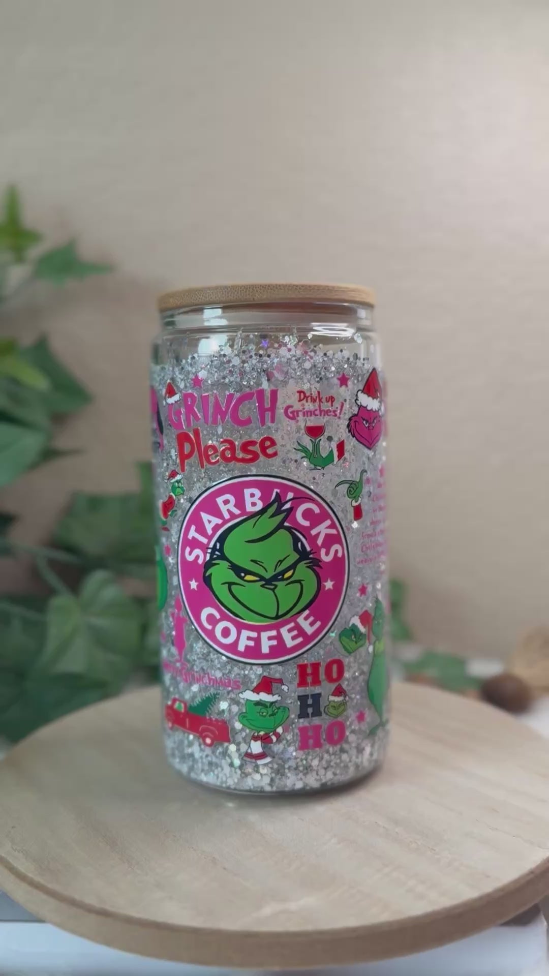 16 oz Double Wall Glass Can Snow Globe. Usable cup comes with hard plastic straw. Give it a shake to see the glitter move.