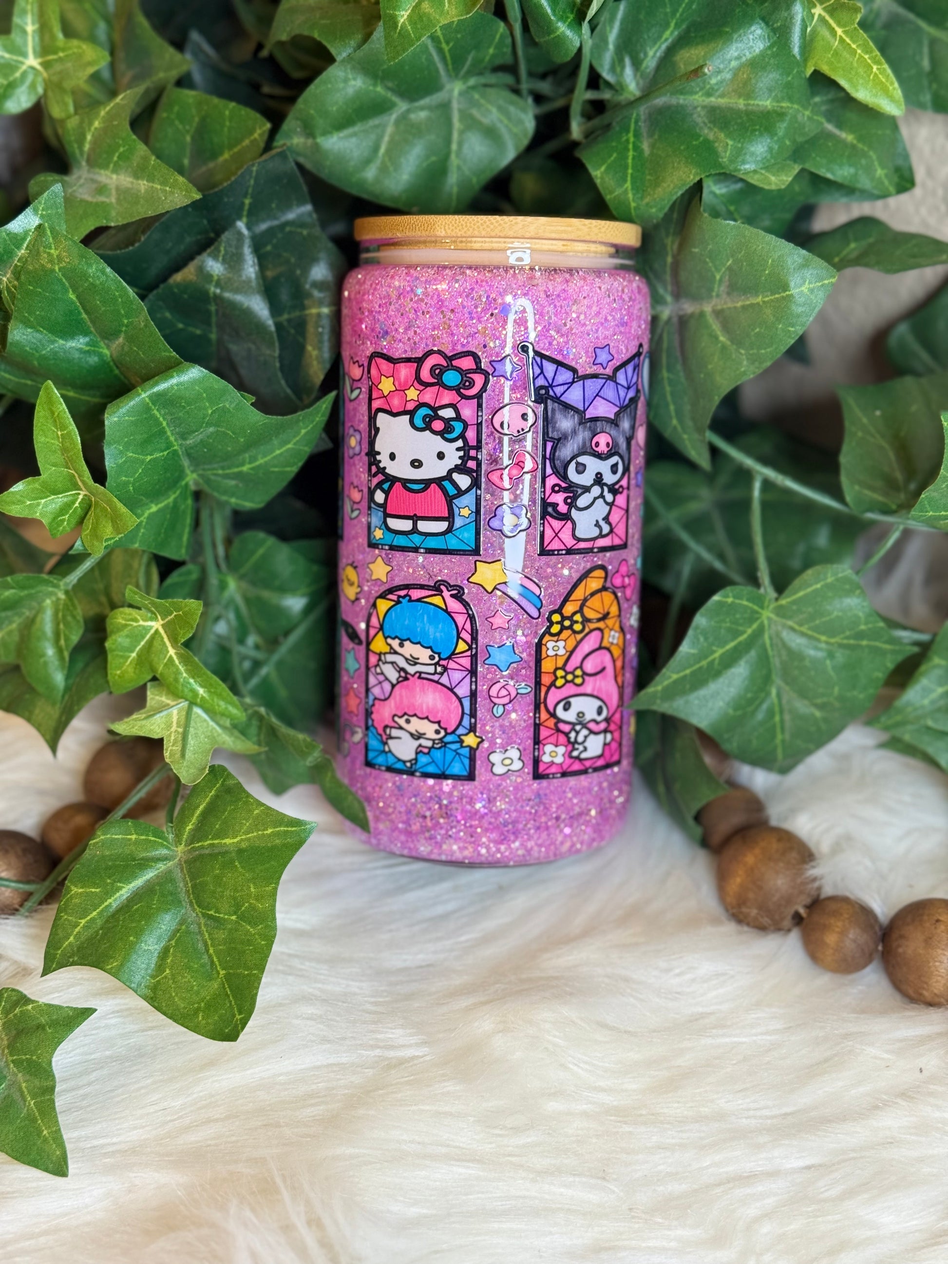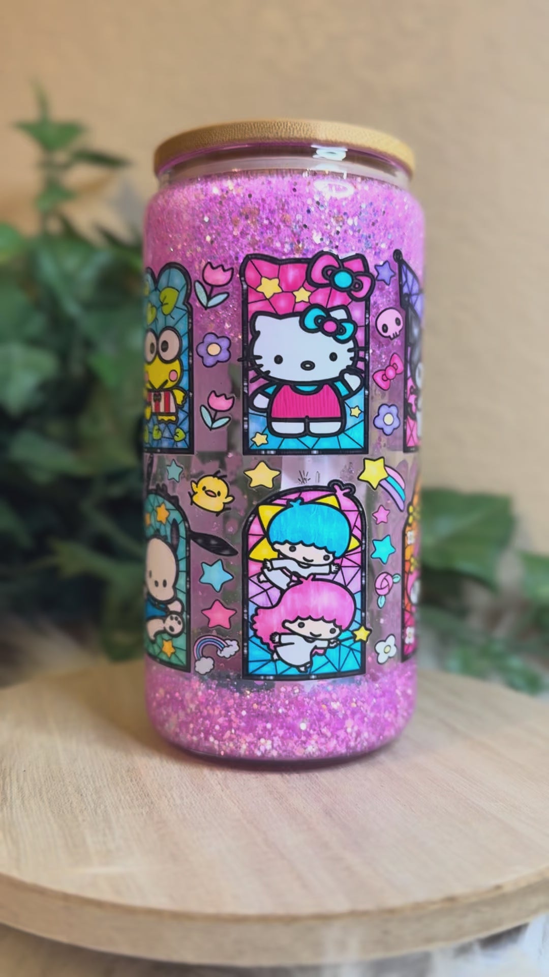 16 oz Double Wall Glass Can Snow Globe. Usable cup comes with hard plastic straw. Give it a shake to see the glitter move.