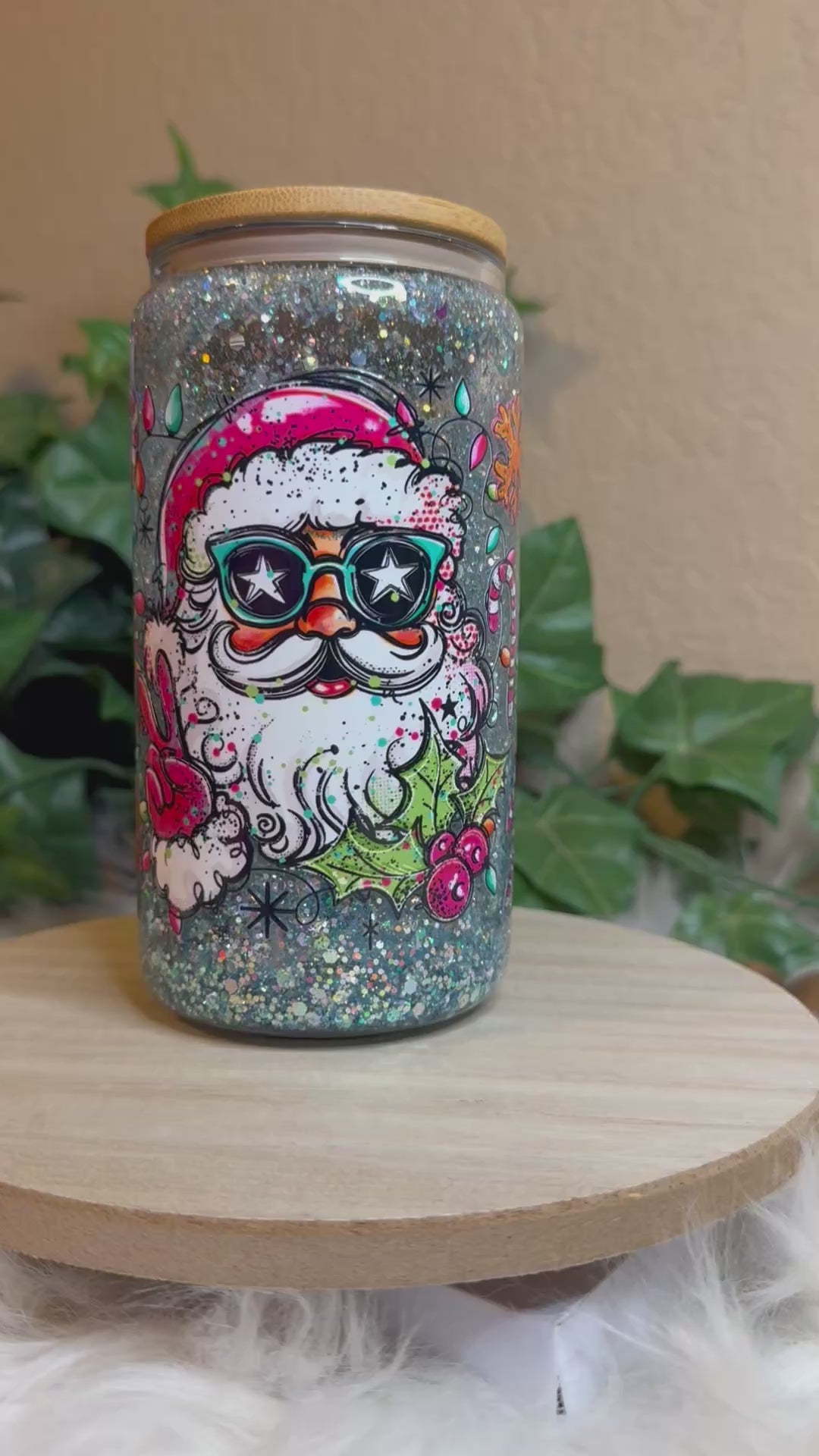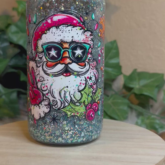 16 oz Double Wall Glass Can Snow Globe. Usable cup comes with hard plastic straw. Give it a shake to see the glitter move.