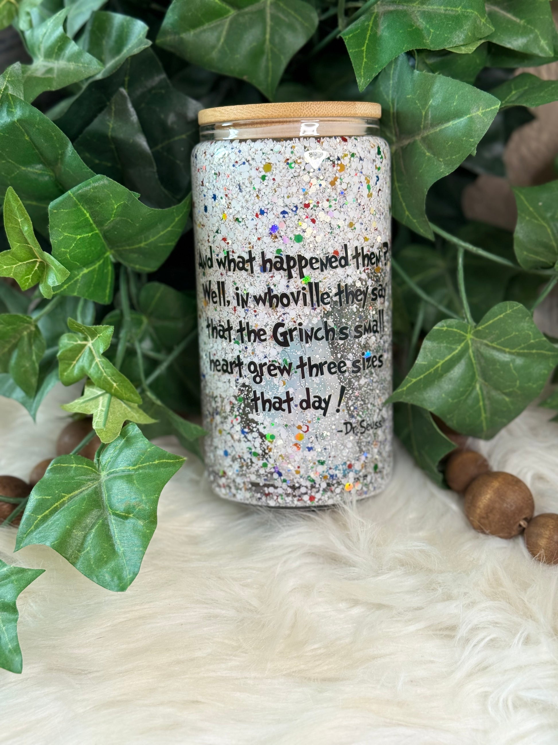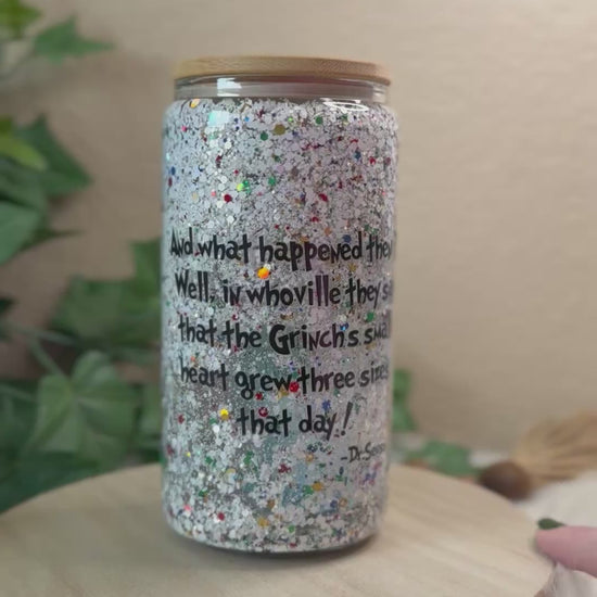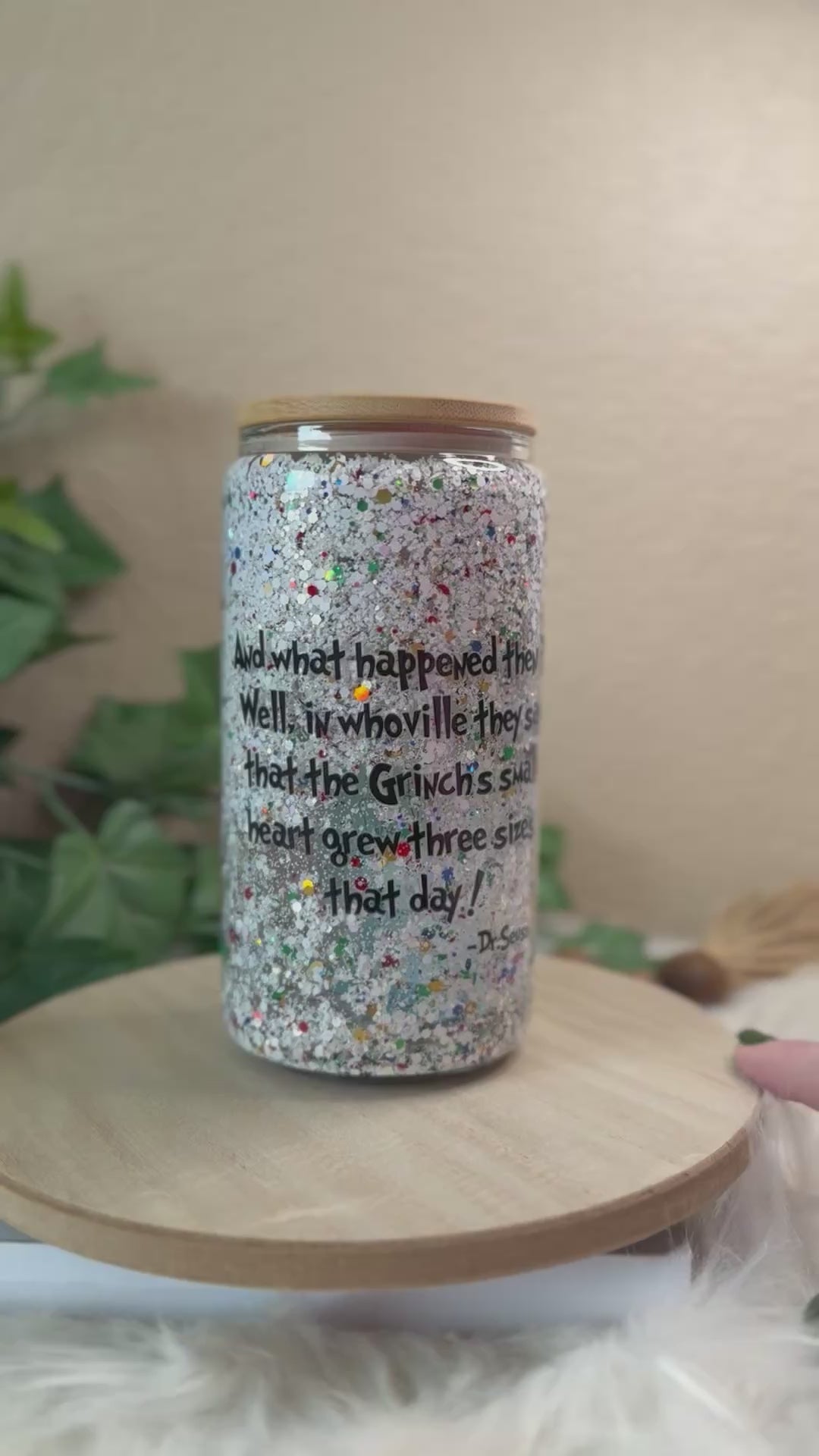 16 oz Double Wall Glass Can Snow Globe. Usable cup comes with hard plastic straw. Give it a shake to see the glitter move.