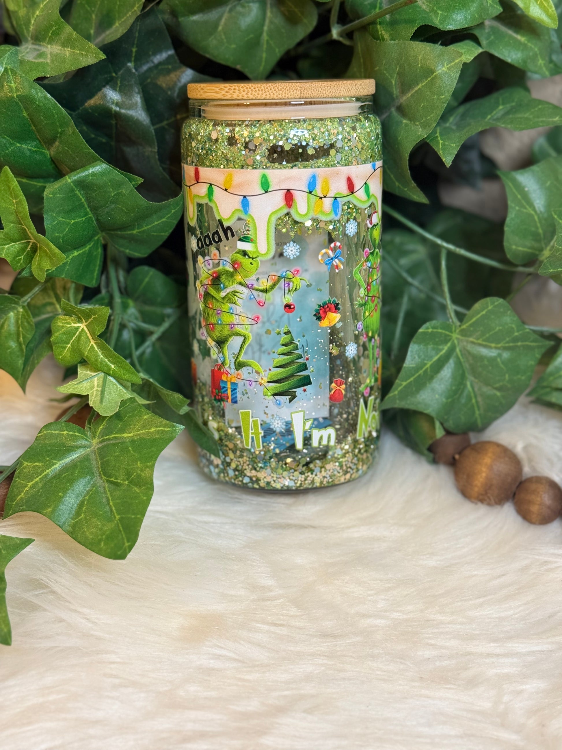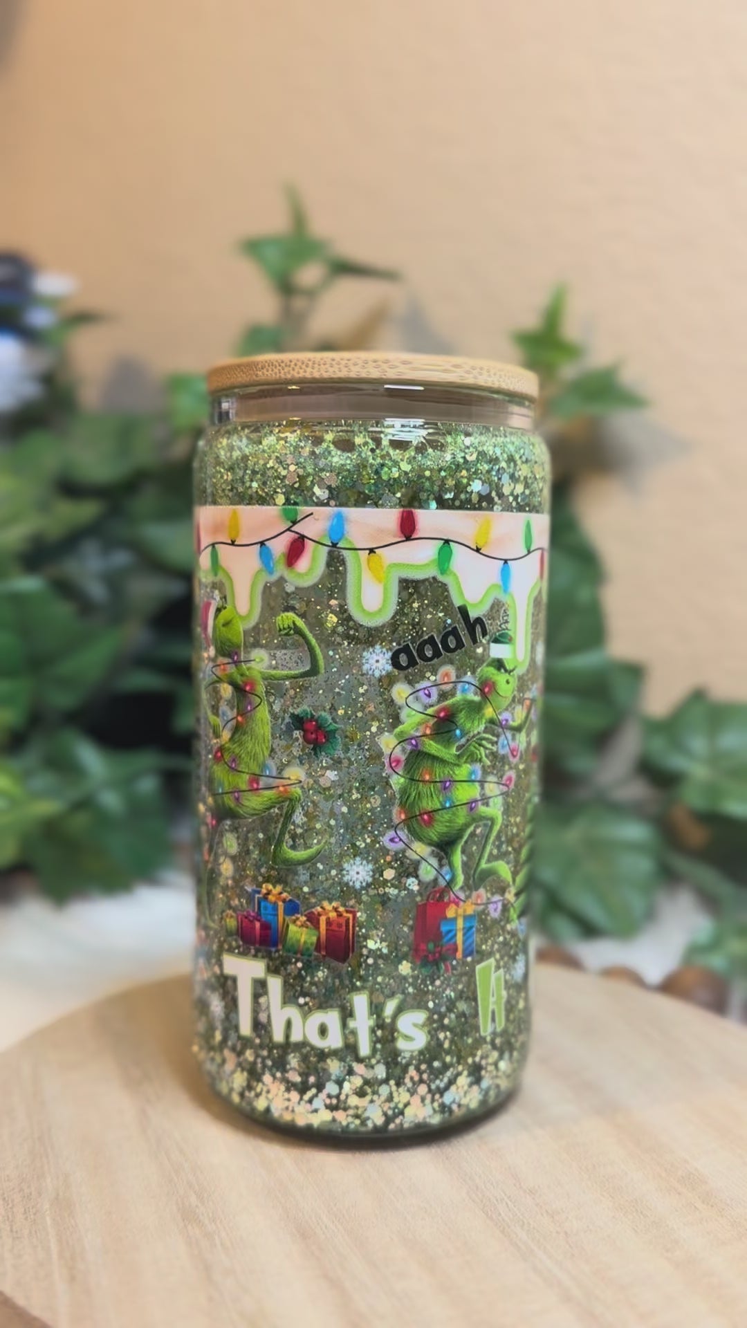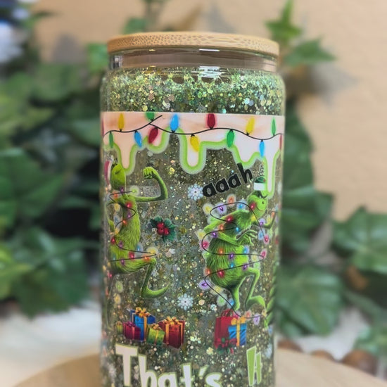 16 oz Double Wall Glass Can Snow Globe. Usable cup comes with hard plastic straw. Give it a shake to see the glitter move.