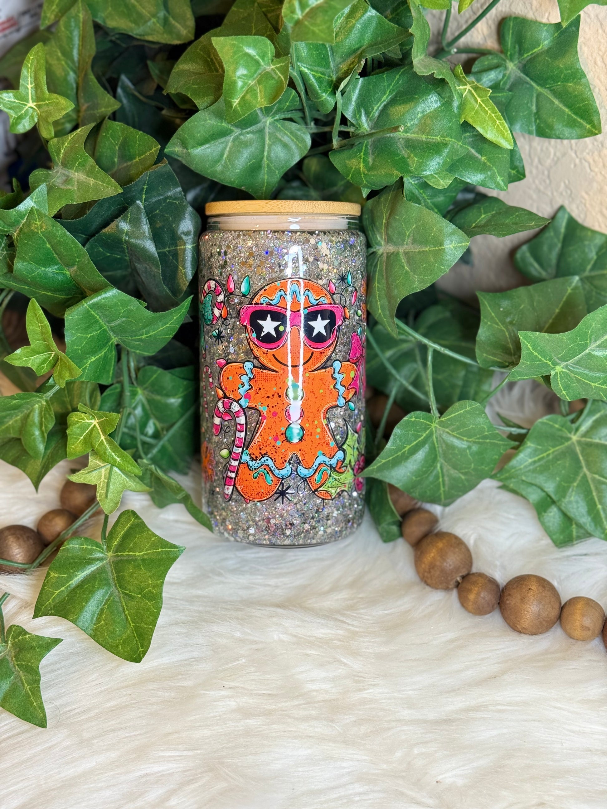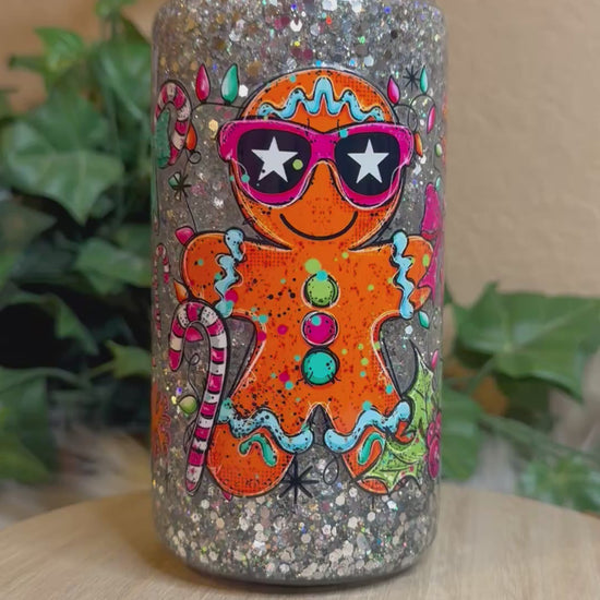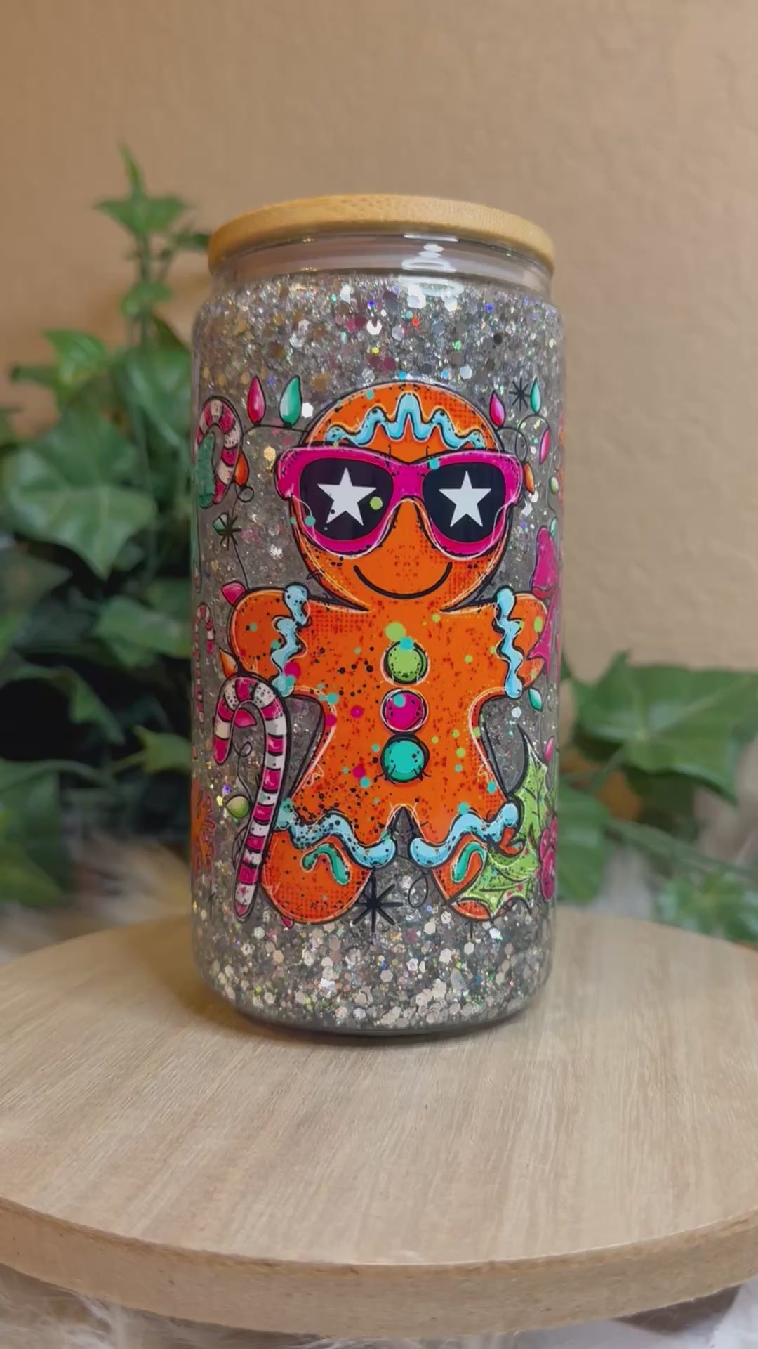 16 oz Double Wall Glass Can Snow Globe. Usable cup comes with hard plastic straw. Give it a shake to see the glitter move.