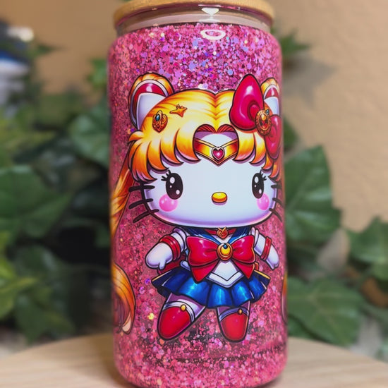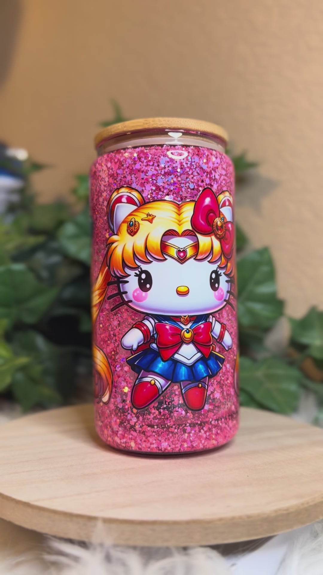 16 oz Double Wall Glass Can Snow Globe. Usable cup comes with hard plastic straw. Give it a shake to see the glitter move.