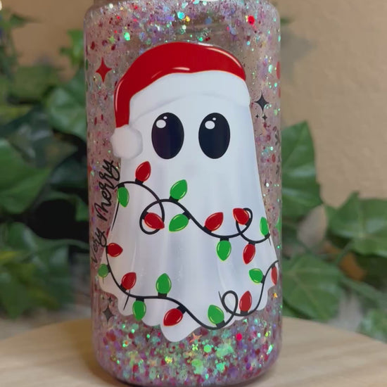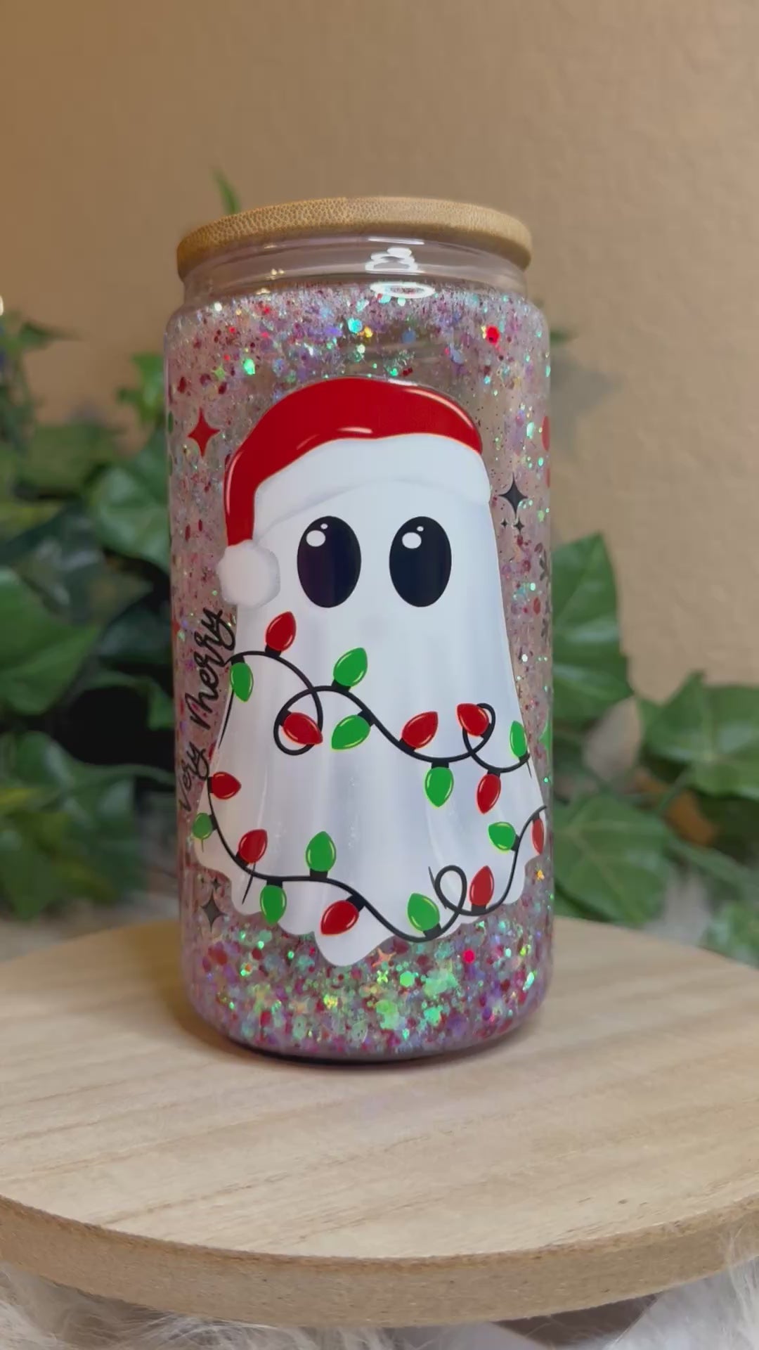 16 oz Double Wall Glass Can Snow Globe. Usable cup comes with hard plastic straw. Give it a shake to see the glitter move.