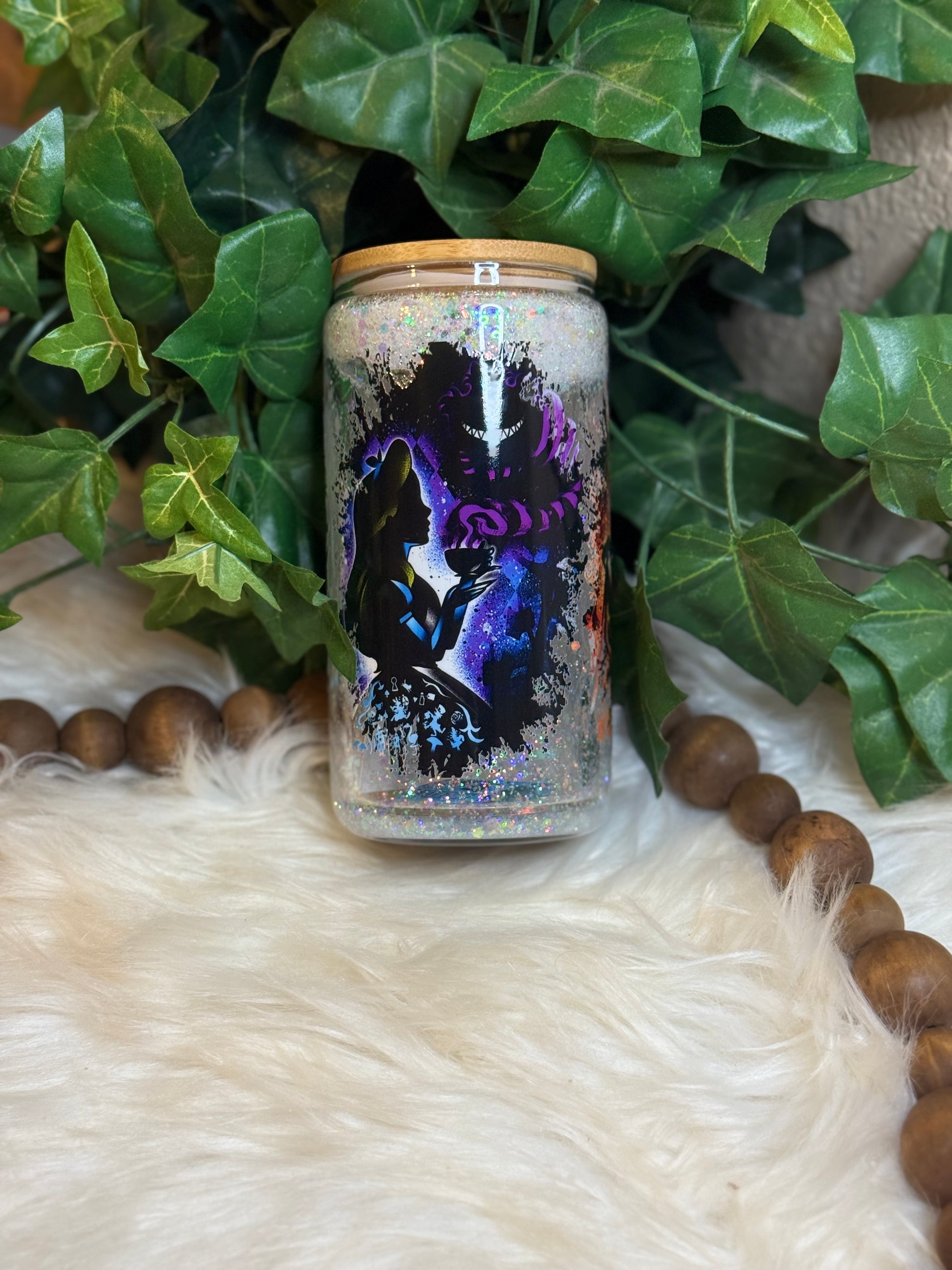 16 oz Double Wall Glass Can Snow Globe. Usable cup comes with hard plastic straw. Give it a shake to see the glitter move.