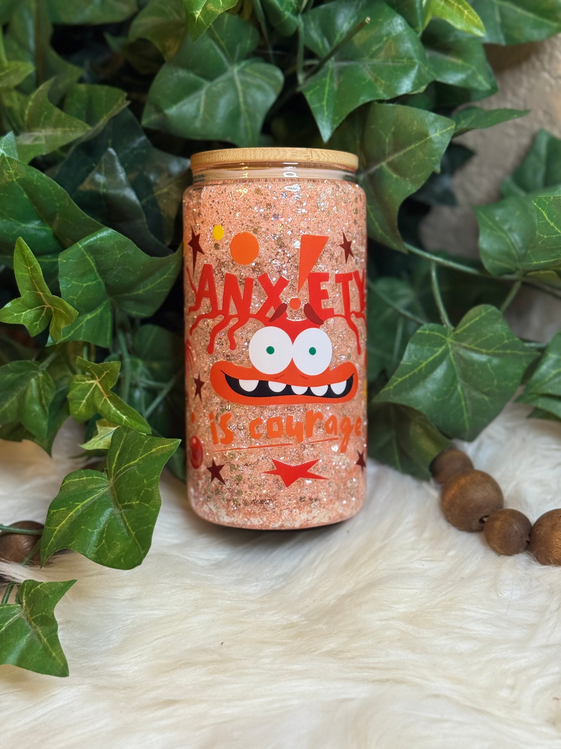 16 oz Double Wall Glass Can Snow Globe. Usable cup comes with hard plastic straw. Give it a shake to see the glitter move.