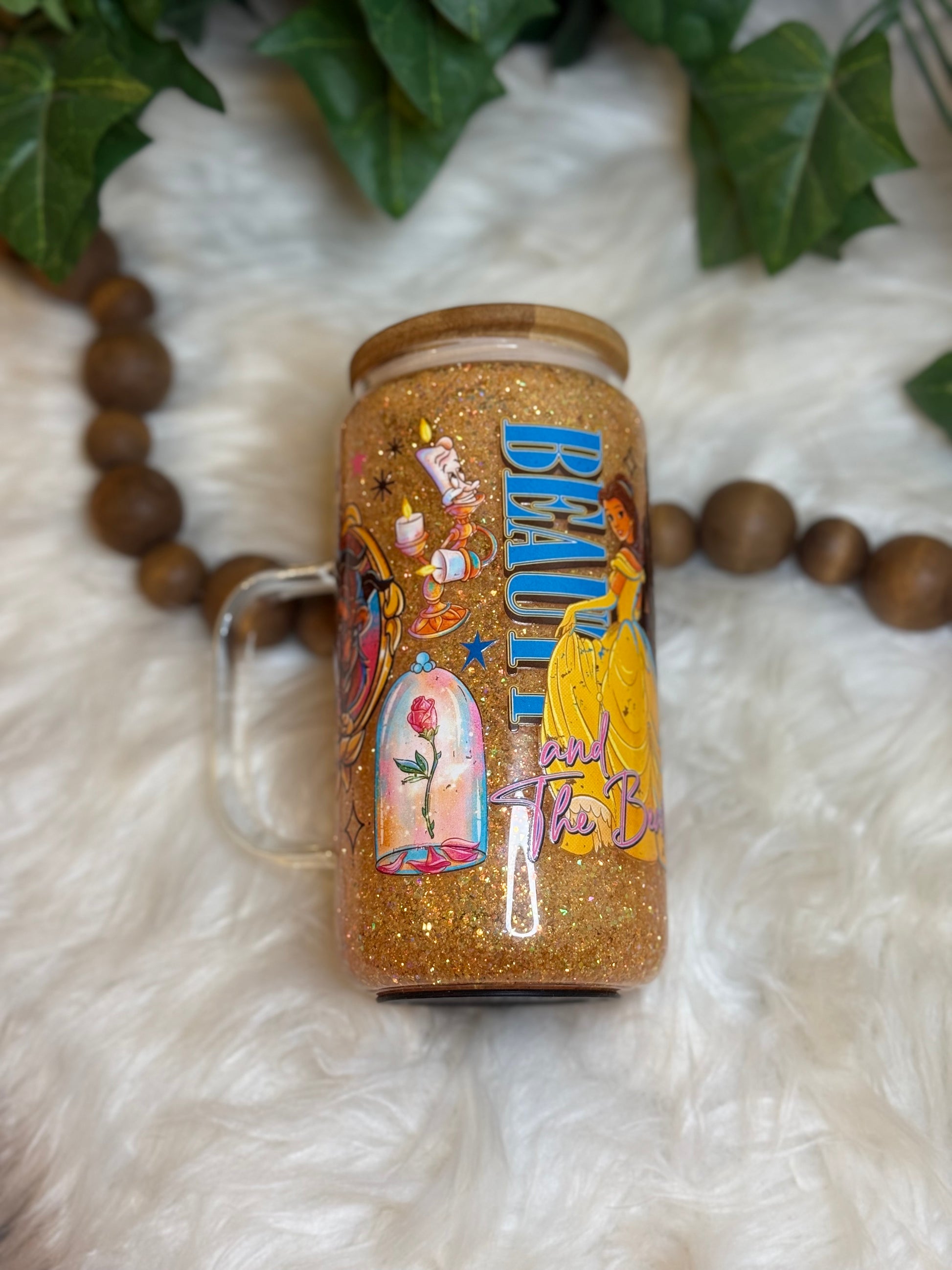16 oz Double Wall Glass Can Snow Globe. This cup has a handle. Usable cup comes with hard plastic straw. Give it a shake to see the glitter move.