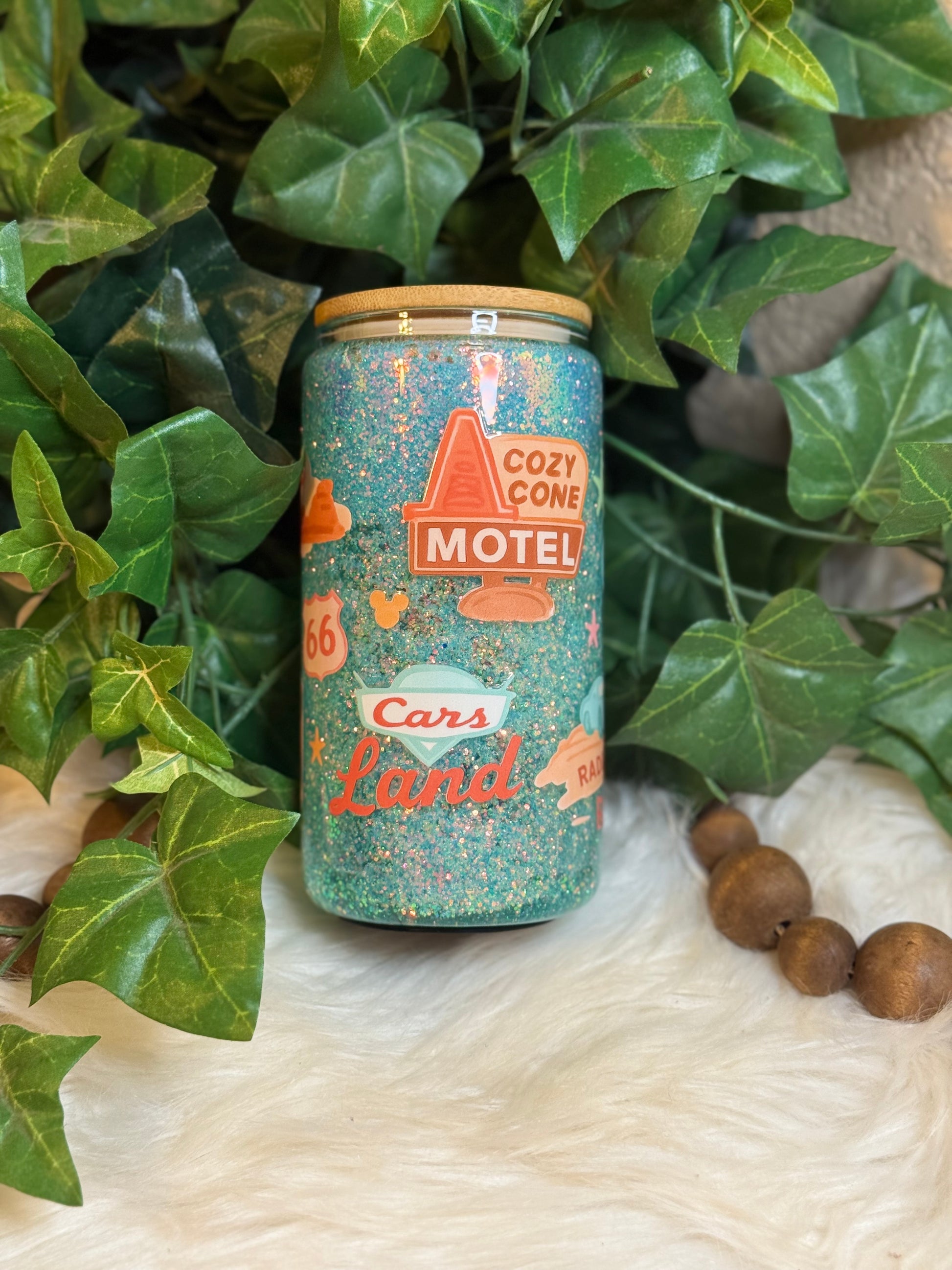 16 oz Double Wall Glass Can Snow Globe. Usable cup comes with hard plastic straw. Give it a shake to see the glitter move.