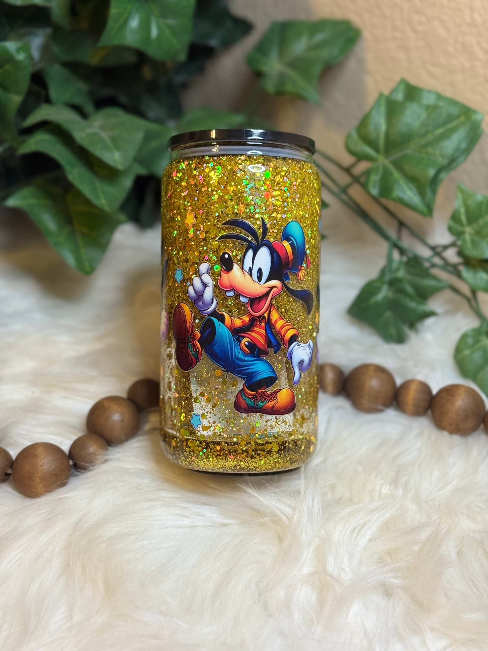 16 oz Double Wall Glass Can Snow Globe. This cup has a handle. Usable cup comes with hard plastic straw. Give it a shake to see the glitter move.