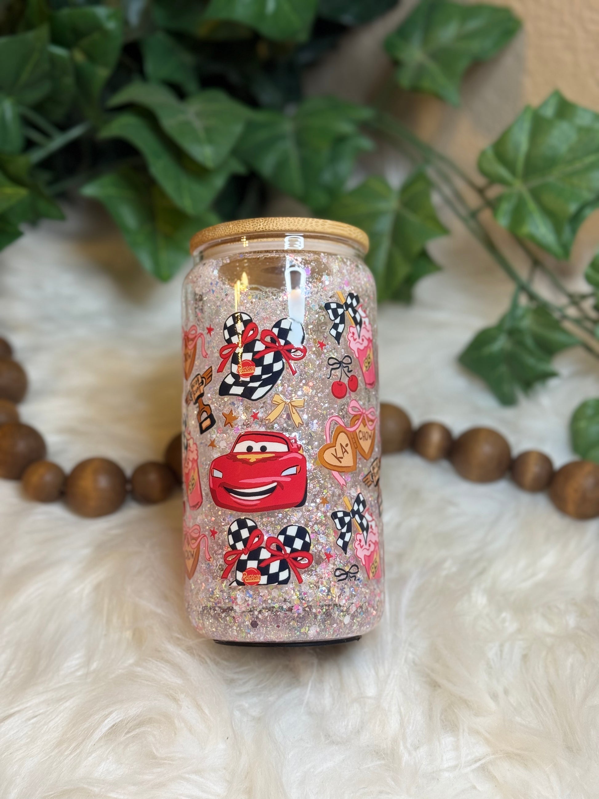 16 oz Double Wall Glass Can Snow Globe. This cup has a handle. Usable cup comes with hard plastic straw. Give it a shake to see the glitter move.