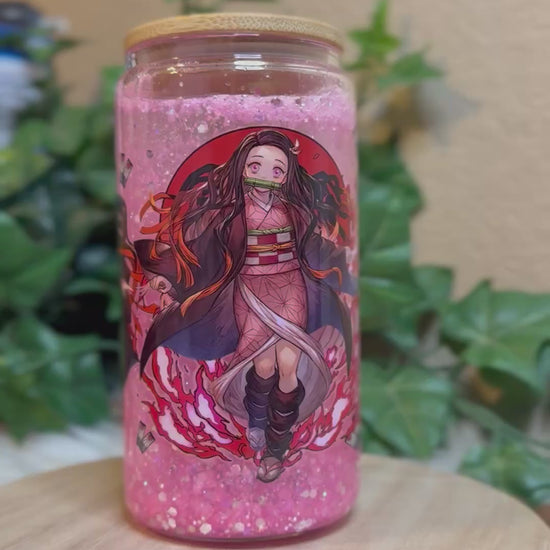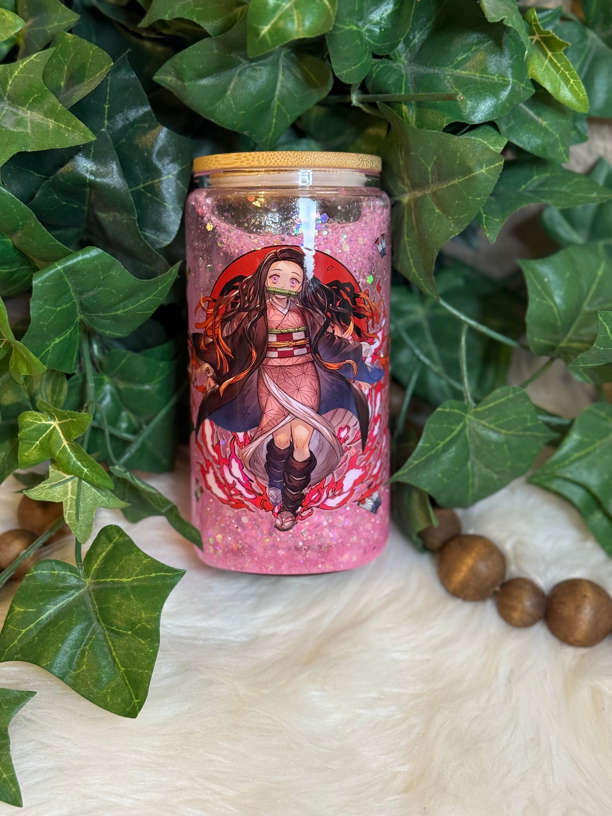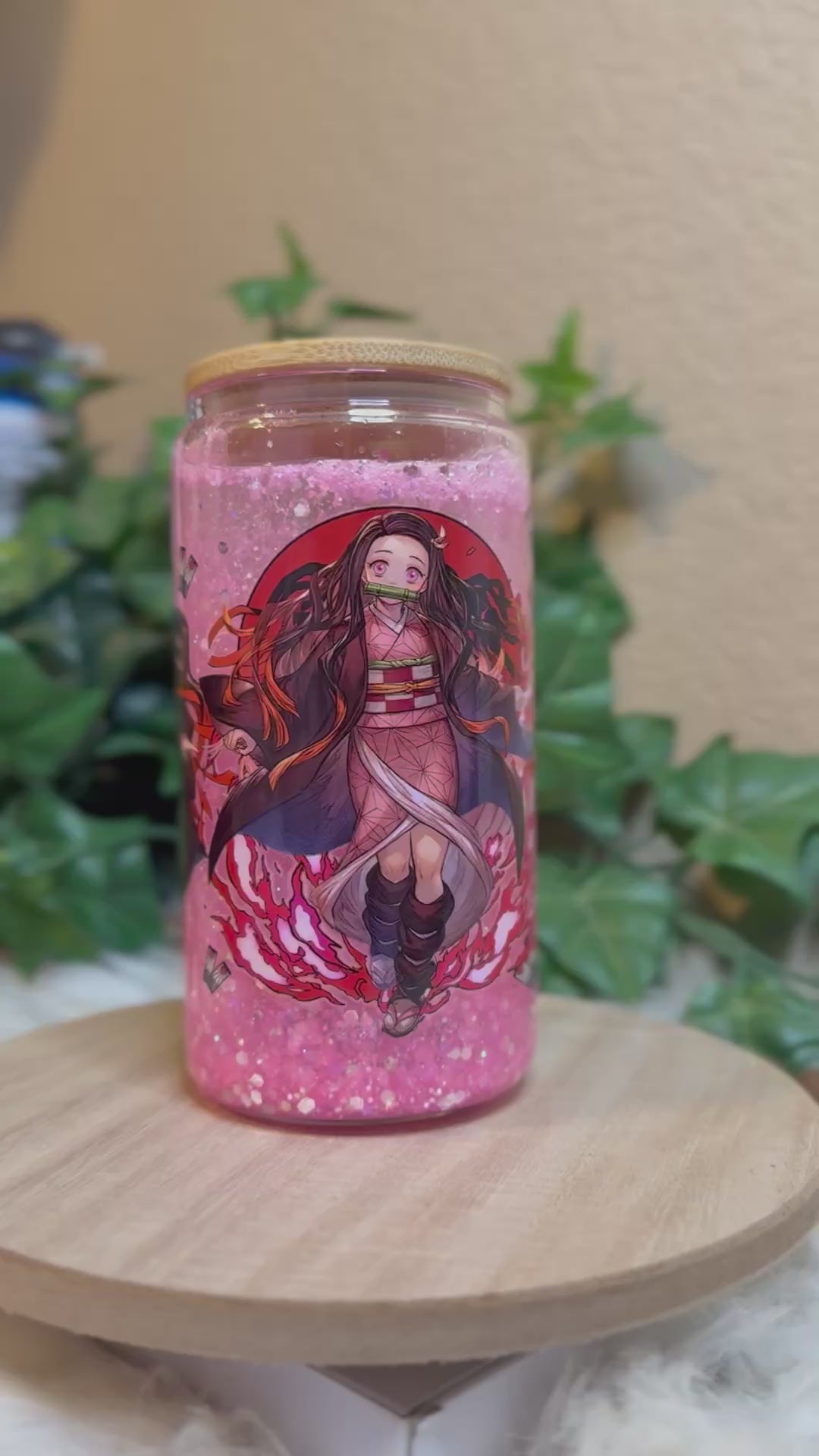 16 oz Double Wall Glass Can Snow Globe. Usable cup comes with hard plastic straw. Give it a shake to see the glitter move.