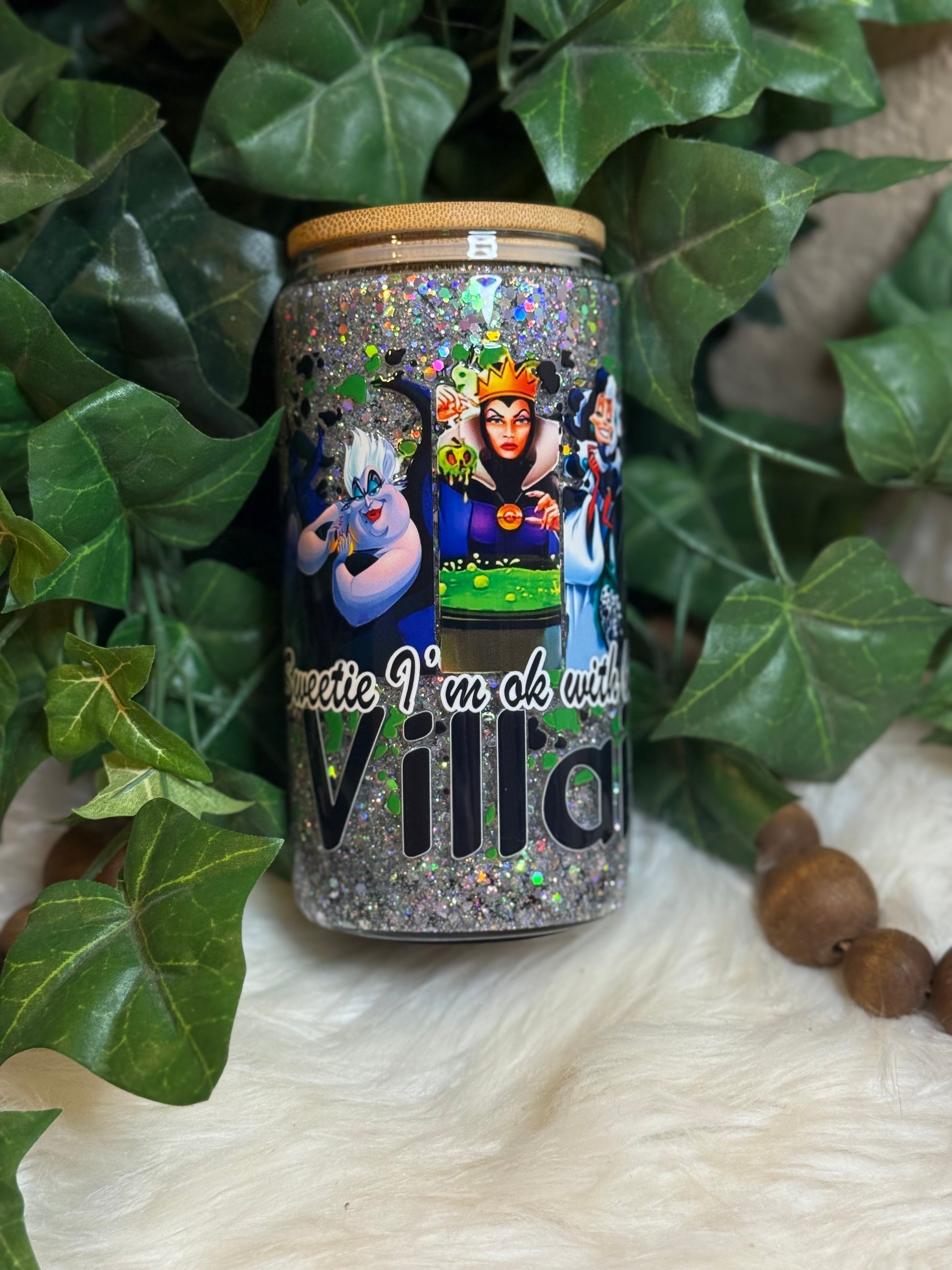 16 oz Double Wall Glass Can Snow Globe. Usable cup comes with hard plastic straw. Give it a shake to see the glitter move.